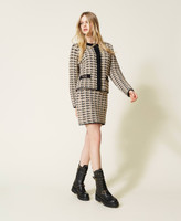 Jacquard-Jacke aus Wollmischgarn mit mehrfarbigem Hahnentrittmuster, stilisierten „Oval T“-Trensen aus Metall und Druckknöpfen.