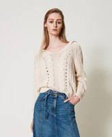 In Italien gefertigter Pullover aus Baumwollmischgarn mit Dessin aus Zöpfen, Durchbrüchen und Linkmaschen, V-Ausschnitt, Kapuzenkragen, langen Ärmeln mit gerippten Bündchen und lockerem Schnitt.