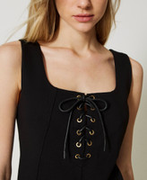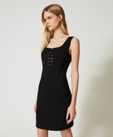 Kurzes, tailliertes, gefüttertes Kleid aus elastischem Milano-Strick mit Flechtwerk und Metallösen am Vorderteil und seitlichem Reißverschluss.