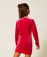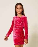 Kurzes Mädchen-Etuikleid aus Chenille mit „Oval T“-Logo und Raffung auf der Vorderseite. Das gefütterte Modell hat einen asymmetrischen Ausschnitt, lange Ärmel, einen verdeckten Reißverschluss an der Rückseite und einen anliegenden Schnitt.