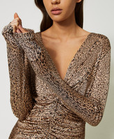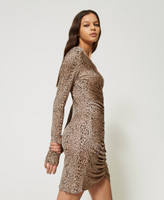 Kurzes Kleid aus Viskosejersey mit Animalprint, figurbetontem Schnitt, Faltenwurf an der Vorderpartie und hautengen Ärmeln.
