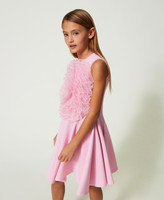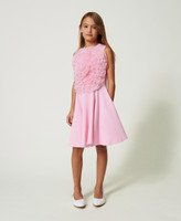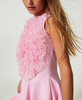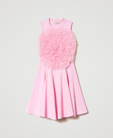 Kurzes, ärmelloses Kleid aus elastischem Milano-Strick aus Viskose mit ausgestellt geschnittenem Rock und Maxirose aus Organza auf der Vorderpartie.