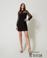 Kurzes Kleid aus der Actitude Collection aus einem Gewebe aus Viskosemischung in gefrosteter Optik mit Passe und Ärmeln aus Plumetis-Tüll. Das gefütterte und leicht ausgestellt geschnittene Modell mit Bindeschleife am Hals und Seitenreißverschluss ist an den langen Ärmeln mit Hemdmanschetten versehen. Dieses elegante Kleid eignet sich perfekt für besondere Anlässe.