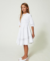 Dieses elegante und minimalistische kurze Mädchenkleid aus elastischem Milano-Strick aus Viskose wird von Einsätzen aus floraler Spitze und gewellten Borten mit Fadenstickerei verziert. Versehen ist das Rundhalsmodell mit Dreiviertelärmeln, einer Taillennaht, einem ausgestellten Rock und einem Reißverschluss an der Rückseite. Komfortabler Chic für besondere Anlässe.
