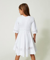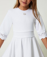 Kurzes Kleid aus elastischem Milano-Strick aus Viskose mit floralem Spitzeneinsatz und gewellten Borten mit Fadenstickerei.