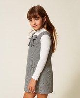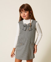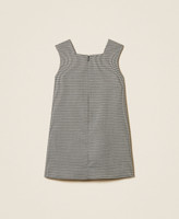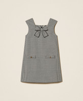 Ärmelloses Mädchenkleid aus Stoff mit Hahnentrittmuster. Das Modell hat einen Karree-Ausschnitt mit Schleife, Leistentaschen auf der Vorderseite, einen Reißverschluss auf der Rückseite, ein Futter und einen geraden Schnitt.