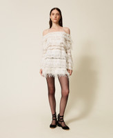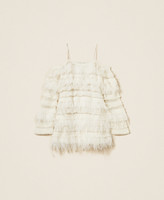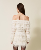 Kurzes Off-Shoulder-Kleid aus Strick mit durchbrochener Strickstruktur und applizierten Volants und Federn im Wechsel, die horizontale Streifen erzeugen und dem Kleid Volumen verleihen. Locker geschnittenes Langarmmodell mit schmalen Trägern.
