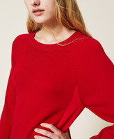 Kurzes, ausgestelltes Stickkleid aus Viskosemix mit seitlichen Einsätzen aus Crêpe, gekräuselten Volants und langen Ärmeln.