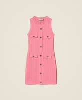 Figurbetontes kurzes Mädchenkleid aus glattem Viskosestrick mit Rundhalsausschnitt, Patten und Logo-Knöpfen aus Metalllogo.