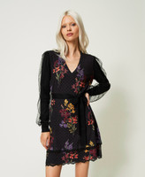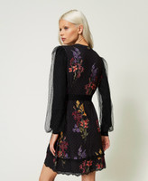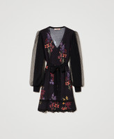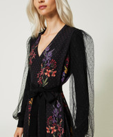 kurzen Strickkleid aus Viskose-Stretch-Mischung, das mit einem Exklusiv-Dessin von Twinset bedruckt ist, das Allovertupfen und Bouquets, die von englischen botanischen Gärten inspiriert wurden, zum Motiv hat. Das ausgestellt geschnittene Modell mit V-Ausschnitt ist an den langen Ärmeln mit einem Schleier Plumetis-Tüll bedeckt. Dazu kommen ein Volant an der Unterpartie mit Spitzenrand, gerippte Bündchen und eine „Oval T“-Logoplakette an der Rückseite. Die Taillenpartie lässt sich mit dem Ripsbandgürtel anpassen.