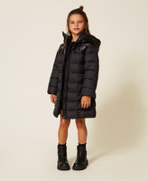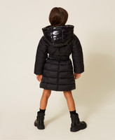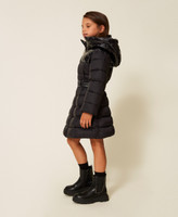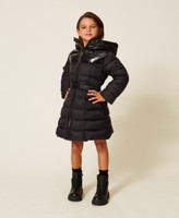 Lange gesteppte und wattierte Mädchenjacke mit Einsätzen aus glänzendem Nylon und passendem Stretchgürtel mit Logoschnalle aus Metall. Das ausgestellt geschnittene Modell hat einen Kapuzenkragen, einen Reißverschluss und eingesetzten Seitentaschen.