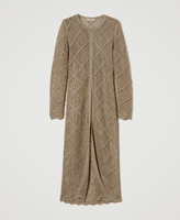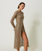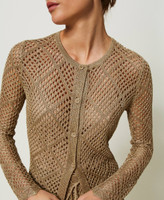 Long-Cardigan aus Viskose-Lurex-Mischung mit Netzmaschen mit geometrischem Rautenmuster und Festonrändern.