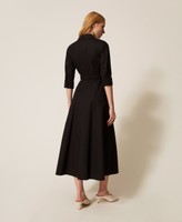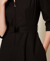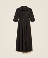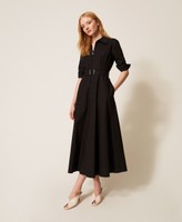 Langes Kleid aus der Kollektion Actitude aus Baumwollpopeline mit elastischem Gürtel und Automatikschnalle aus Metall. Figurbetontes Modell mit ausgestelltem Rock, Hemdkragen und einer Öffnung mit Reißverschluss, ellenbogenlangen Ärmeln mit Knöpfen, einer Doppelnaht auf Taillenhöhe und am Schößchen sowie Eingrifftaschen.