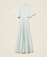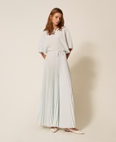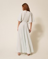 Langes Kleid aus Crêpe de Chine (100 % recycelter, zertifizierter Pre-Consumer-Polyester) mit Plissee-Verarbeitung. Locker geschnittenes Modell mit Rundhalsausschnitt, 3/4-Ärmeln, Taillennaht, Tropfenöffnung mit Knopf am Rücken und Seitenreißverschluss. Etwaige Mikroverunreinigungen sind typisch für recycelte Materialien.