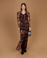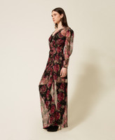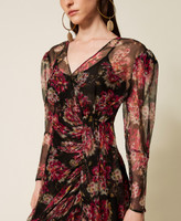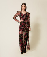 Langes Kleid in Wickeloptik aus Seidenkrepon „Made in Italy“ mit malerischem floralem Print, exklusives Twinset-Design. Figurbetontes Modell mit gekreuztem V-Ausschnitt mit asymmetrischer Kräuselung, langen, lockeren Ärmeln mit Kräuselung an den Ärmelansätzen, Seitenreißverschluss und einem Unterkleid aus Georgette.