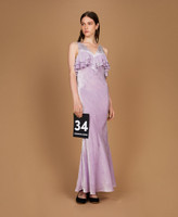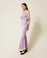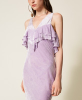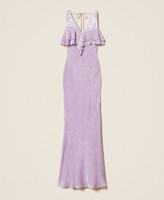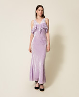 Langes Kleid aus Pannesamt aus Seide und Viskose mit Ton-in-Ton-Kaschmirmuster im Dévoré-Stil, exklusives Twinset-Design. Figurbetontes Modell mit V-Ausschnitt mit doppeltem Volant, tiefem Rückenausschnitt, einem Schlauchband zum Binden auf der Rückseite, einen Seitenreißverschluss und einem knielangen Futter Viskose-Georgette.