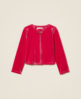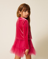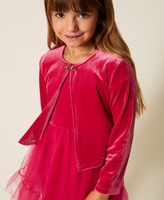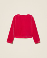 Mädchen-Schulterwärmer aus Samt mit „Oval T“-Verschluss am Hals. Das gerade geschnittene Modell hat Abnäher vorne und hinten an den Flanken, lange Ärmel und ein Futter aus Stretchjersey.