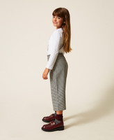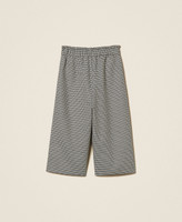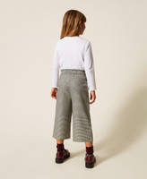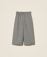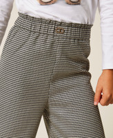 Cropped-Mädchenhose aus Stoff mit Hahnentrittmuster. Das Modell hat einen elastischen Taillenbund mit kleinen Rüschen und ist weit geschnitten.