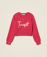 Mädchenpullover aus Viskosemischung im Patentmuster und aufgesticktem Logoschriftzug in Kontrastfarbe. Das Modell hat einen Rundhalsausschnitt, lange Ärmel und einen geraden Schnitt.