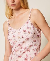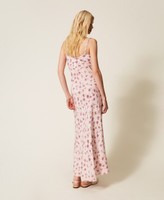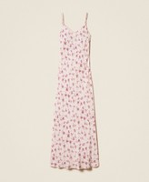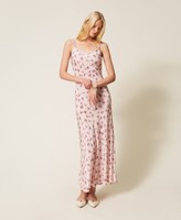 Langes Kleid aus schräg verarbeitetem Jacquard-Satin mit exklusivem floralem Twinset-Print. Figurbetontes Modell mit großzügigem Ausschnitt und schmalen Trägern mit Posamenten.