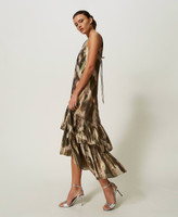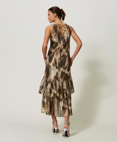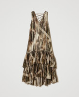 Dieses Maxikleid aus bedrucktem Voile aus Baumwolle und Lurexgarn besticht durch seinen feinen Schimmer und sein spezielles Volumen. Der V-Ausschnitt an der Vorder- und Rückseite dieses ärmellosen Modells lässt sich hinten durch eine Flechtkordel verstellen. Vervollständigt wird das Gesamtbild von breiten Trägern, asymmetrischen Rüschenvolants an der Unterpartie und einem passenden Unterkleid. Zur Abrundung passen flache Sandalen oder auch High Heels dazu – je nach Geschmack.