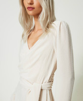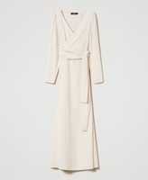 Dieses langärmlige Maxikleid aus Fil-Coupé-Krepp mit Lurexfäden besticht durch seinen tiefen V-Ausschnitt mit überlappendem Design, die zur Schleife gebundenen Bänder an der Rückseite, schicke Seitenschlitze und einen Seitenreißverschluss. Dazu noch High Heels und eine Handtasche für feine Abendlooks.