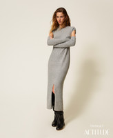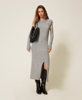 Langes Kleid aus der Actitude Revive Collection aus recyceltem Garn (50 % recycelter Polyester) mit abnehmbaren Armlingen. Das Modell hat einen Rundhalsausschnitt, einen Schlitz vorne in der Mitte, eine Logoplakette auf der Rückseite und einen figurbetonten Schnitt. Das Modell gehört zum Conscious Program „Revive“ von Actitude by Twinset.