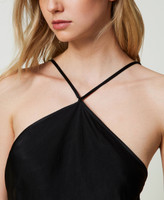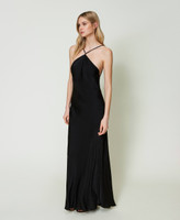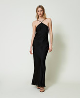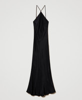 Figurbetontes Maxi-Slipdress aus Viskosesatin mit amerikanischer Schulter mit schmalen Trägern und Überkreuzung am Rücken.
