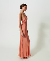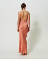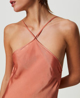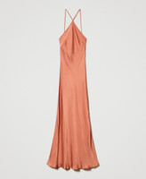 Figurbetontes Maxi-Slipdress aus Viskosesatin mit amerikanischer Schulter mit schmalen Trägern und Überkreuzung am Rücken.