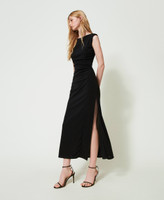 Betonen Sie Ihre Silhouette mit diesem langen Kleid aus Interlockjersey von kreppartigem Griff mit geraffter Taille. Das figurbetonte Rundhalsmodell ist mit einem Seitenreißverschluss, einem Seitenschlitz und einer „Oval T“-Logoplakette an der Rückseite versehen. Die feine Eleganz und das komfortable Gewebe eignen sich perfekt für all Ihre besonderen Anlässe.