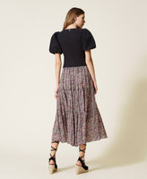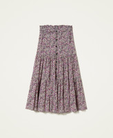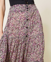 Maxirock aus Viskosegeorgette mit aufgedrucktem Blumenbouquet-Mikrodessin, elastischem Taillenbund, gerafften Stufen und Knöpfen.