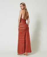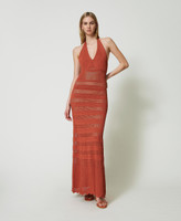 Gefüttertes Maxistrickkleid aus Viskosemischung mit V-Ausschnitt, Futter und streifenförmig angeordneten Durchbruchmustern mit Seethrough-Effekt.