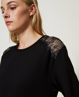 Langärmliges Midikleid aus Scuba mit Rundhalsausschnitt und Besatz aus Spitze mit Unterlage aus Crêpe de Chine an der Unterpartie.