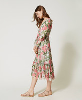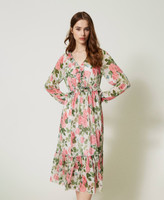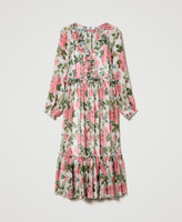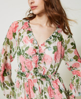Midikleid aus Georgette-Krepon mit Rosenprint, mit Zierrändern mit gerafftem Volant und passendem Unterkleid.