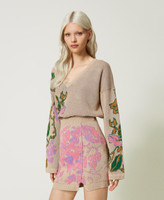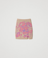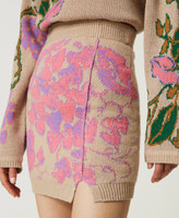 Minirock wurde in Zusammenarbeit mit Marco Rambaldi designt und besteht aus Treeblend-Garn. Der Jacquard-Piqué besticht durch ein vierfarbiges platziertes Rankenmotiv mit herzförmigen Weinrispen. Das figurbetonte Modell mit elastischem Taillenbund und gerippten Bündchen trägt ein Label an der Innenseite mit Jacquardlogo und kontrastierendem zweifarbigem Logo-Lettering. Das TREEBLEND-Projekt zielt darauf ab, die CO2-Emissionen im Vergleich zu herkömmlichen Produktionsverfahren für Strickwaren zu reduzieren: erwartete Reduzierung -20 %.