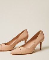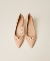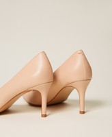 Pumps aus Kalbsleder mit spitz zulaufender Zehenpartie, Metall-Logo, Stiletto-Absatz und Thunitsohle.