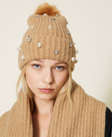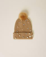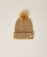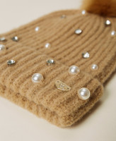 Strickmütze mit aufgestickten Perlen und Strasssteinchen, Plüschpompon und Logoplakette.