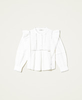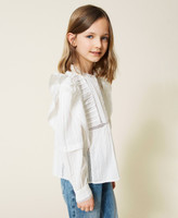 Diese feine, originelle Mädchenbluse aus Baumwollmusselin mit Streifentextur und eingesetzten Spitzenborten aus Baumwolle wird an den Ärmeln von breiten Volants verziert. Versehen ist das Modell mit einer Knopfleiste am Hals, langen Manschettenärmeln und Falten an der Brust. In der Twinset-Kollektion für Damen finden Sie das Pendant zu diesem Modell, mit dem Sie den perfekten Partnerlook für Sie und Ihre Kleine zusammenstellen können.