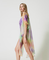 Poncho aus Organza mit Tie-Dye-Print, Tropfenausschnitt am Hals mit Bindeschleife und Seitenschlitzen.