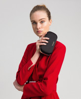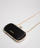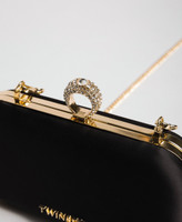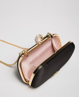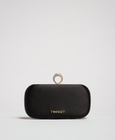 Pochette in Clutch-Form aus Satin mit Steckverschluss und Strass-Ring, Ketten-Schulterriemen.
