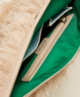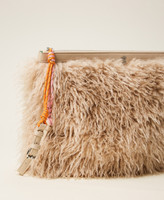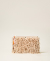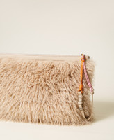 Vom Künstler Myfo für die Kollektion Actitude entworfene weiche Clutch aus Kunstpelz in Mongolia-Optik mit Öffnungseinfassung aus glattem Gewebe in Kalbslederoptik. Die Tasche ist ausgestattet mit einem Reißverschluss, einer Handschlaufe aus Kordel und Gewebe in Lederoptik, einer verstellbaren Schnalle und einem Metall-Logo auf der Vorderseite.