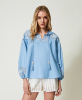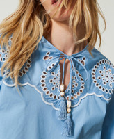 Bluse aus Baumwollpopeline mit Lochstickereien, Wellenrändern an der Passe, Tunnelzug mit Quasten am Hals und gerafften Ärmelabschlüssen.