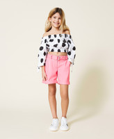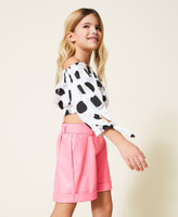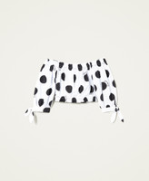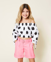 Das klassische Tupfenmuster wurde von Twinset bei dieser Mädchenbluse aus Baumwollpopeline im Makroformat mit Logos interpretiert. Das Modell mit Dreiviertelärmeln und Knoten am Ärmelabschluss ist am Ausschnitt und an der Unterpartie mit einem gerafften Gummiband versehen. Die Bluse kann auch schulterfrei getragen werden.