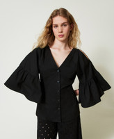 Ein charakteristischer Stil. Popelinehemd mit tiefem V-Ausschnitt, Dreiviertelärmeln mit gerüschtem Volant und Knopfverschluss an der Vorderpartie. Ein aktuelles, voluminöses Design zur Veredelung jedes Looks.