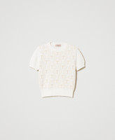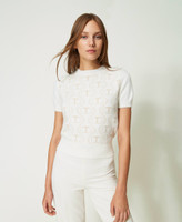 Jacquardpullover aus einer Mischung aus Angora und Lurex im Regular-Fit mit „Oval T“-Logos, Rundhalsausschnitt und kurzen Ärmeln.