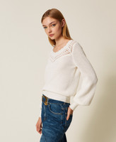 Pullover aus Baumwolle und Wolle im Netzpatent mit handgehäkeltem Einsatz mit Bogenrand an der Passe. Das locker geschnittene Modell hat einen weiten Ausschnitt, lange, leicht bauschige Ärmel und eine „Oval T“-Logoplakette an der Rückseite.