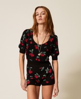 Pullover aus reiner Baumwolle mit Perlmuster und Allover-Kirschen-Print, ein exklusives Twinset-Design. Locker geschnittenes Modell mit weitem Rundhalsausschnitt und kurzen, am Ärmelausschnitt dezent gekräuselten Ärmeln.