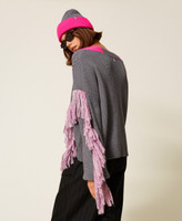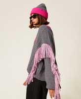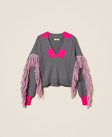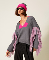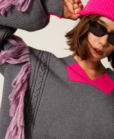 Vom Künstler Myfo für die Kollektion Actitude designter Pullover aus einer Viskosemischung mit Zöpfen an den Seiten sowie mehrfarbigen Fransen an den Ärmeln. Das auf der Rückseite und an den Ärmeln aus Cob-Stitch-Strick gefertigte Modell präsentiert sich auf der Vorderseite im Glattstrick, hat einen breiten V-Ausschnitt mit kontrastierenden Jacquard-Details, lange Ärmel und eine gerade Schnittführung.