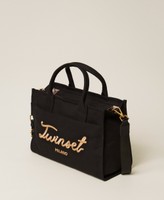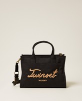 Shopper aus Canvas mit plastisch, mit mattem Garn in Kontrastfarbe gesticktem Logo. Gefüttertes Modell mit einem Reißverschluss, zwei Henkeln zum Tragen in der Hand und einem verstellbaren und abnehmbaren Crossbody-Bandriemen.