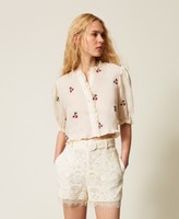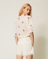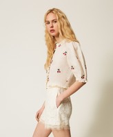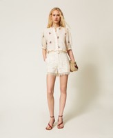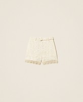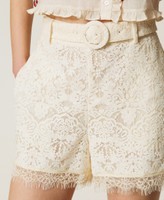 Shorts aus Spitze mit Festonborte am Abschluss. Gerade geschnittenes Modell mit Gürtelschlaufen, Seitentaschen, Seitenreißverschluss und einem abnehmbaren Gürtel mit überzogener Schnalle.